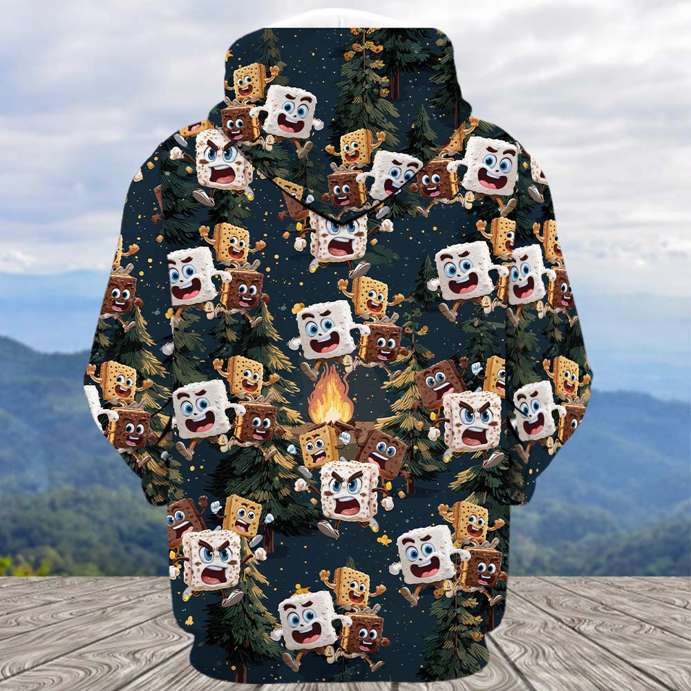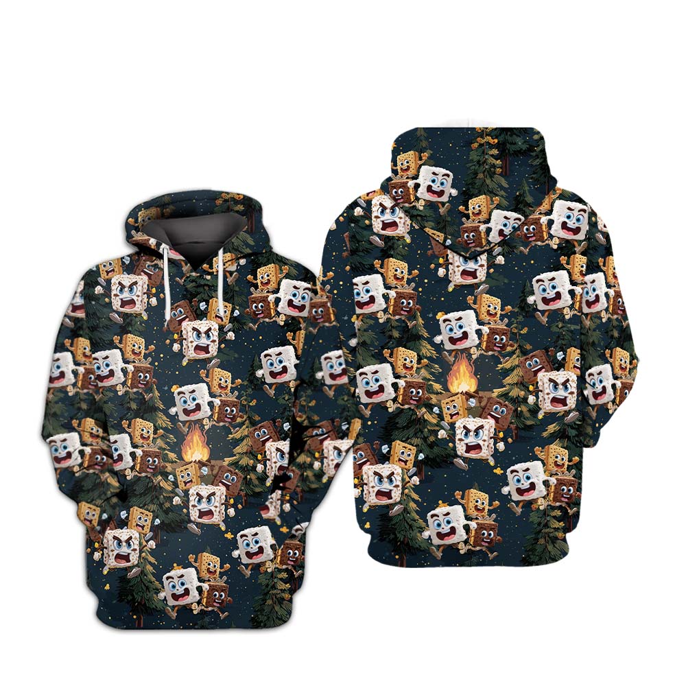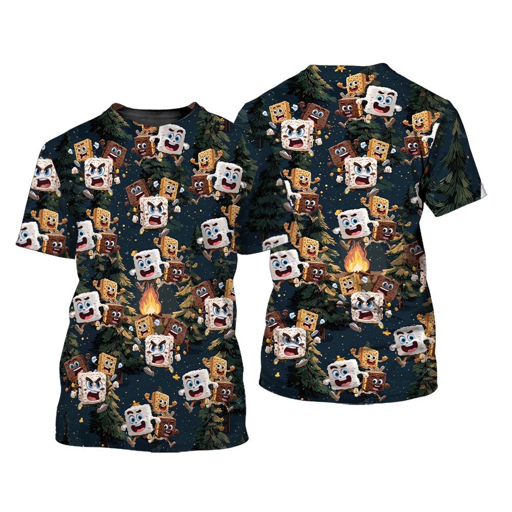 Chocolate and Cracker Chasing Marshmallow Camping All Over Print Shirt